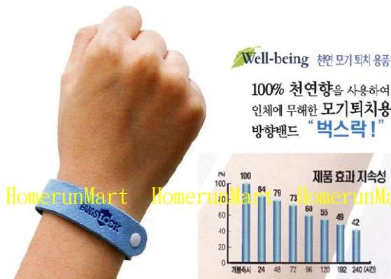 3. 使用時間: 手帶的使用時間為累積240小時,並非10天。如果您今天用了10個小時,半個月後再用,還有230小時。每次用完後,請放回原袋中,捏起自封口保存即可。 一條手帶可累積使用240小時,每次使用完後,請放回原袋內保存,下次再用!上圖為時間功效對比值,第240小時的驅蚊率仍高達42%。 上圖可以看出,未使用驅蚊手帶時,玻璃箱內的蚊子散佈全箱。使用驅蚊手帶後,蚊子都退到箱內最遠處。 4.成分: 香茅精油30%,超微纖維紡織布70%,熏衣草提取物。容量:1條 5. 適合場合: 垂釣,日光浴,露營,郊遊,運動,崗哨等任何場合。 6. 使用方法: 6.1、將防蚊手帶的包裝延開封口撒開。 6.2、將手帶系於手腕,腳腕上,或系于寶寶衣服扣眼,嬰兒車,背包等隨身處即可。 6.3、不要扔掉外包裝袋,防蚊手帶不用時,可放回袋中,捏起袋子自封口保存,以備下次使用。 7.注意: 簡單包裝,大部分客戶用的都不錯的,但不是100%的,有疑問的客戶或要求太高的客戶,請考慮好了再 買. 本商品是正規廠家生產的,不會是貼牌的高麗棒子驅蚊貼,正牌包裝,品質保證!(效果絕對) 超炫超有效的BUGS LOCK韓國Well-Being純天然香茅驅蚊手帶,寶寶大人都可以用,無毒環保!!超人氣的產品!!!8.補充說明: 8.1)皮膚敏感的慎帶這個手環,出現過敏反應及時用清水沖洗. 8.2)對於該手環使用時間及效率.請參考圖中的梯形圖(剛開封效率100%;24小時84%;48小時79%;72小時73%;96小時60%;120小時55%;192小時49%;240小時42%) 8.3)拆封的手環外包裝千萬不要扔哦,使用後及時再次放入包裝會延長其使用壽命,外出的時候帶,回家後將其封入原包裝,這樣能使用挺長的時間哦.